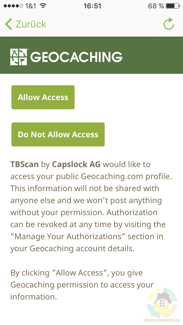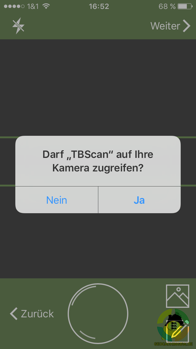 Um die App nutzen zu können, muss man seine Credentials (Zugangsdaten) für geocaching.com eingeben und dann den Zugriff via Live-API erlauben. Damit wird schon ein wichtiger Punkt deutlich: die App braucht zwingend eine Internetverbindung. Ist man mit den GS-Servern verbunden kann man mit dem Scannen anfangen. Dazu bringt man den zu erfassenden Trackingcode zwischen zwei Linien und sobald TBscan diesen erkennt, wird er an die Server geschickt. Sollte der Code zu einem Trackable gehören das noch nicht aktiviert ist, kommt eine entsprechende Meldung und der Code wird nicht verwendet.
