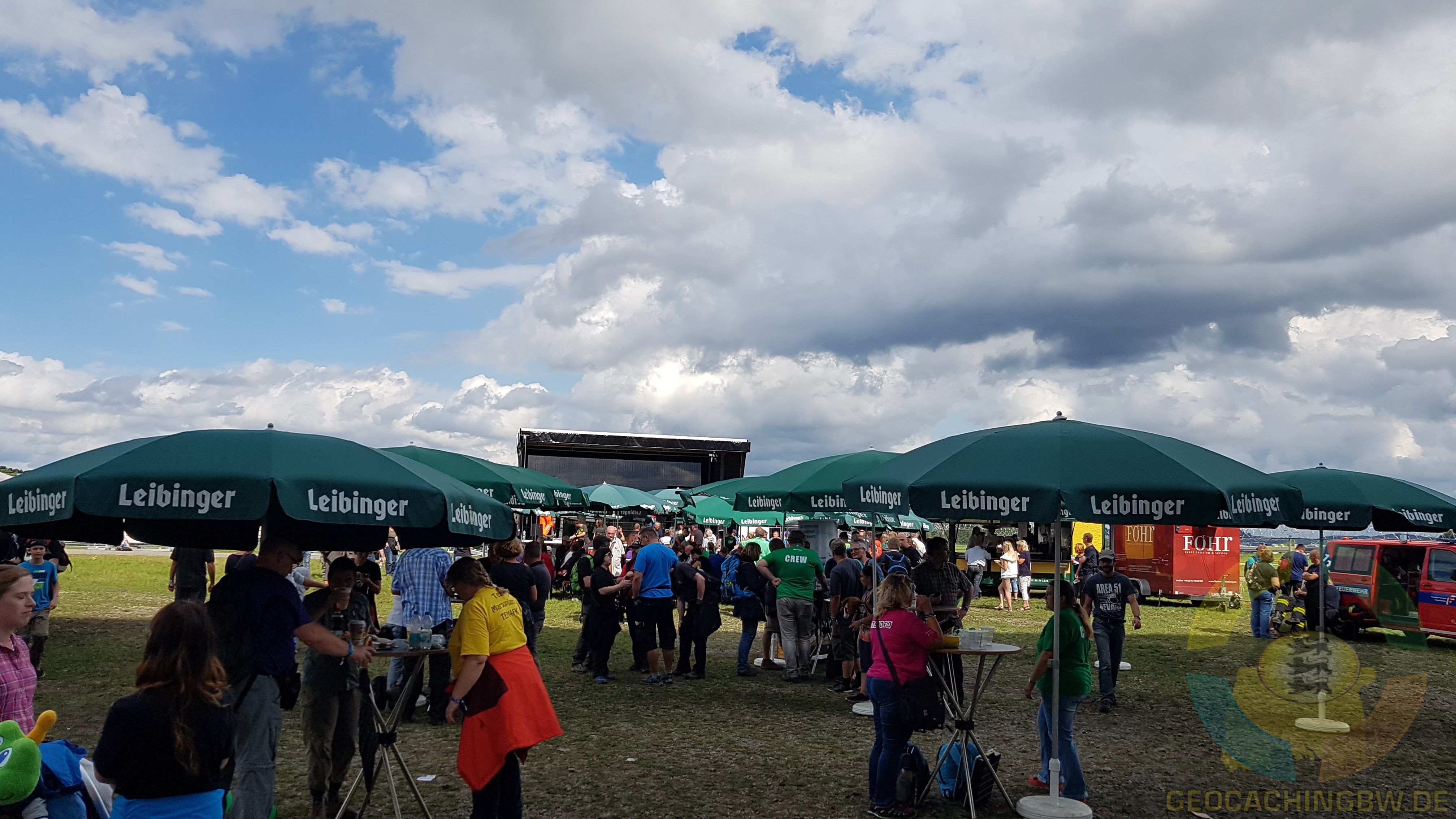 Über den Freitagabend kann ich nur berichten, das mir zugetragen wurde: ein aufziehendes Unwetter verkürzte wohl die Dauer des Welcome-Events, zumindest den Outdoor-Teil in den Biergärten drastisch. Am Samstagmorgen ging es dann weniger dramatisch zu, die Wetterlage entspannte sich zusehends, und lediglich ein kurzer Schauer trieb die Geocacher temporär in den Zeppelinhangar.