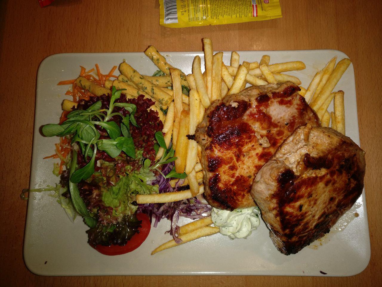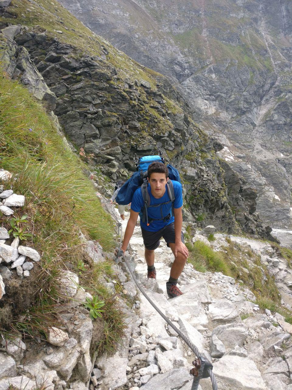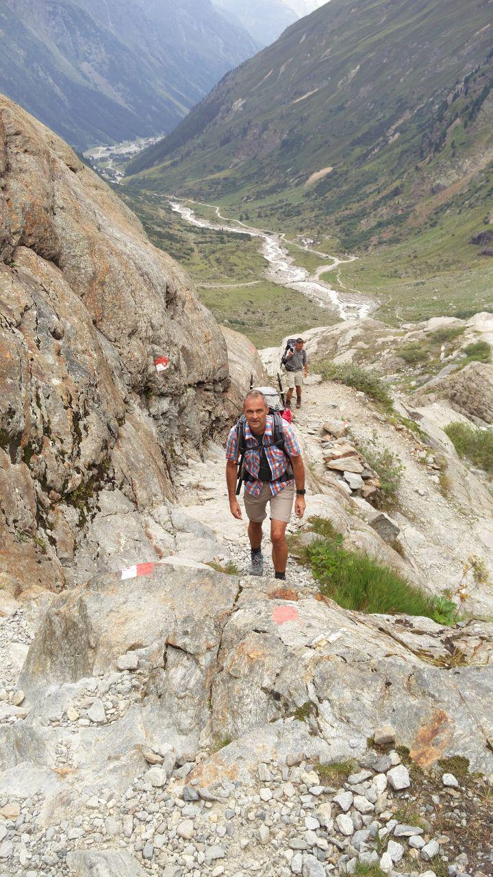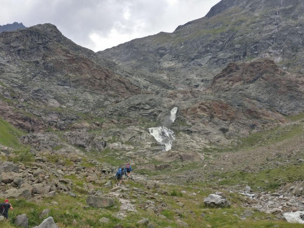 Um uns das Warten auf den Linienbus zu ersparen – der vermutlich auch hoffnungslos überfüllt sein würde – hatten wir uns ein Taxi bestellt, das und fast zum gleichen Preis, dafür aber Nonstop ans Talende nach Mittelberg brachte. Dort erreichten wir nach einer halben Stunde Fußmarsch die Gletscherstube: die letzte Möglichkeit zur Stärkung vor dem Aufstieg zur Braunschweiger Hütte. Während wir auf unser Essen warteten fing es leider leicht zu regnen an. Aufgrund dessen entschieden wir uns schweren Herzens nicht auf dem landschaftlich extrem reizvollen aber auch anspruchsvollen Jägersteig zu gehen, sondern den Wasserfallweg zu nehmen. Dieser führte uns immer wieder bis auf wenige Meter an den Wasserfall heran.