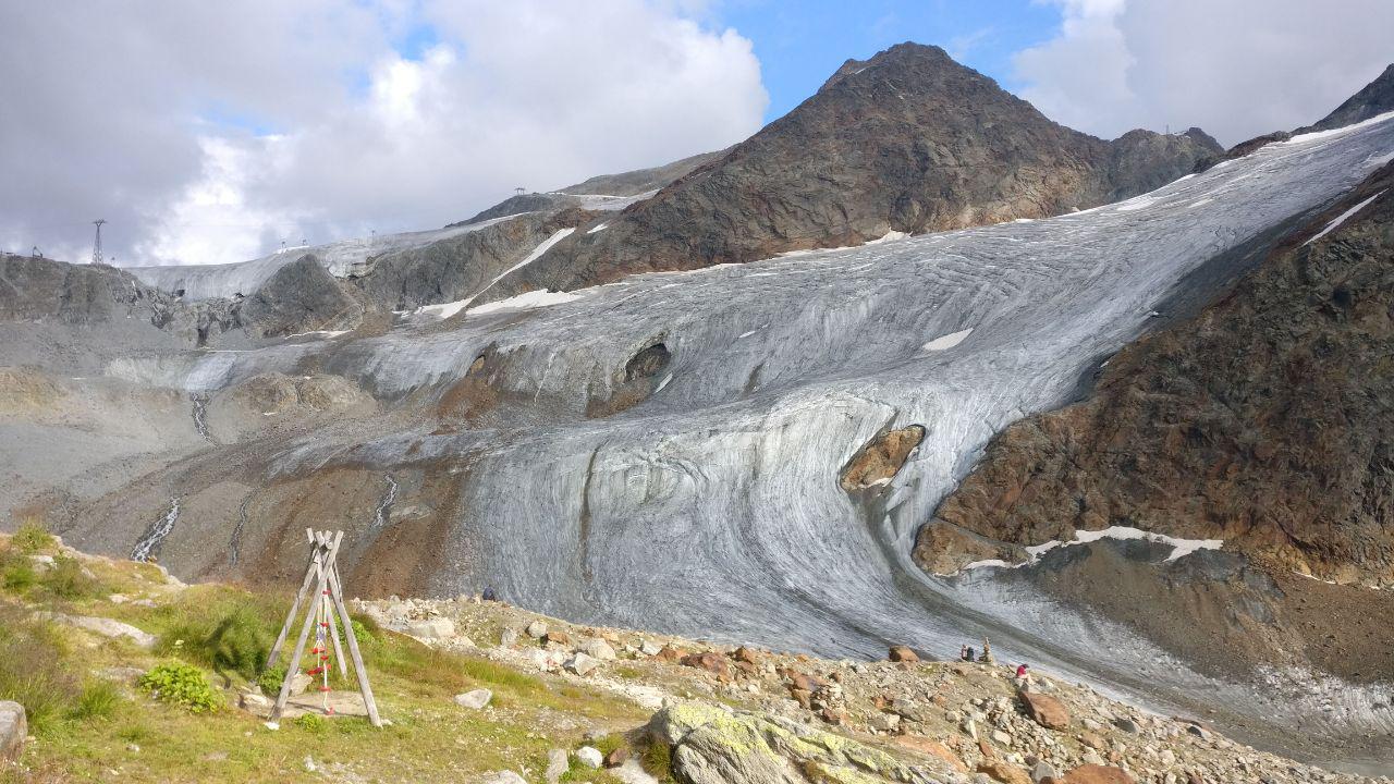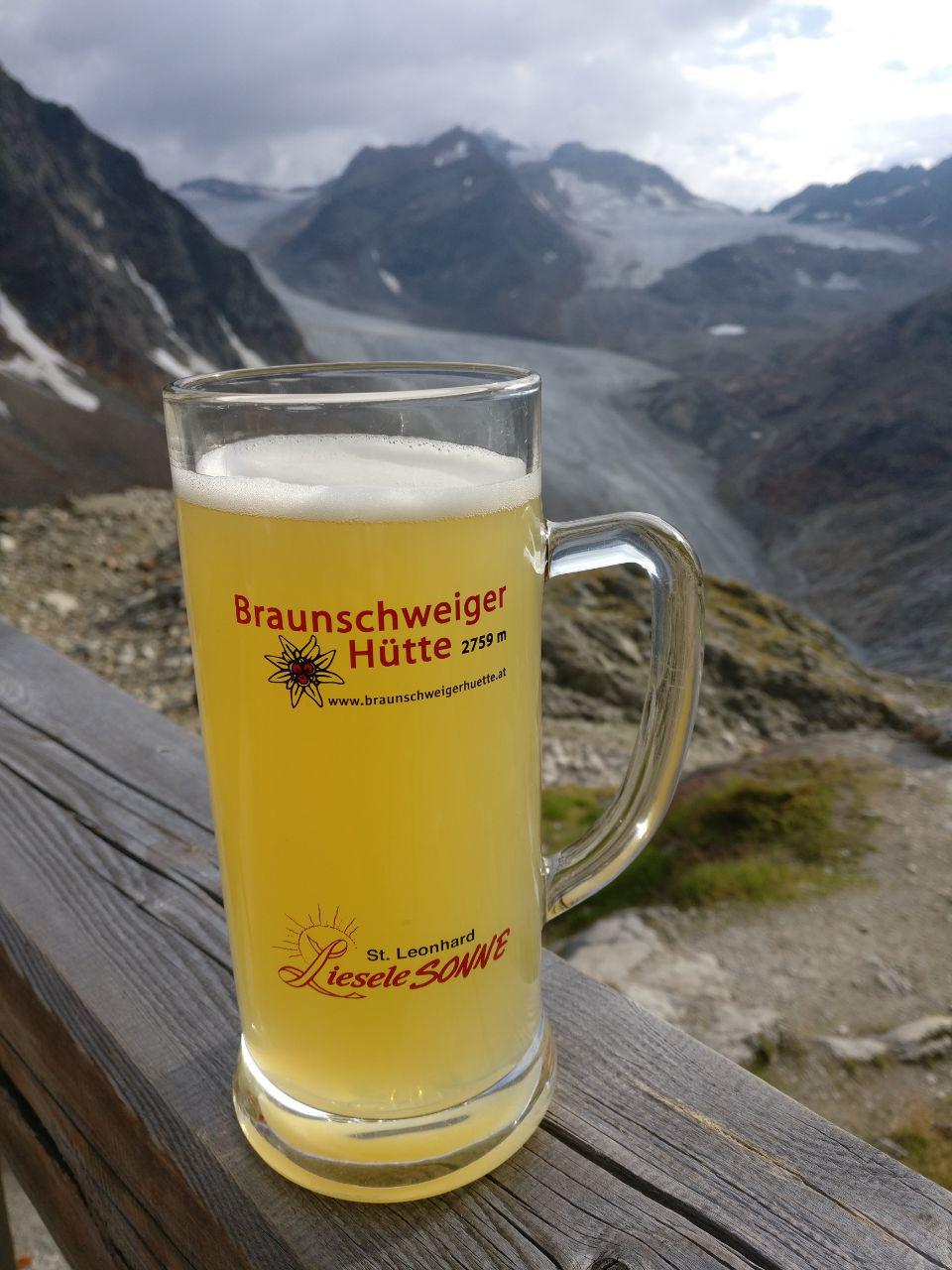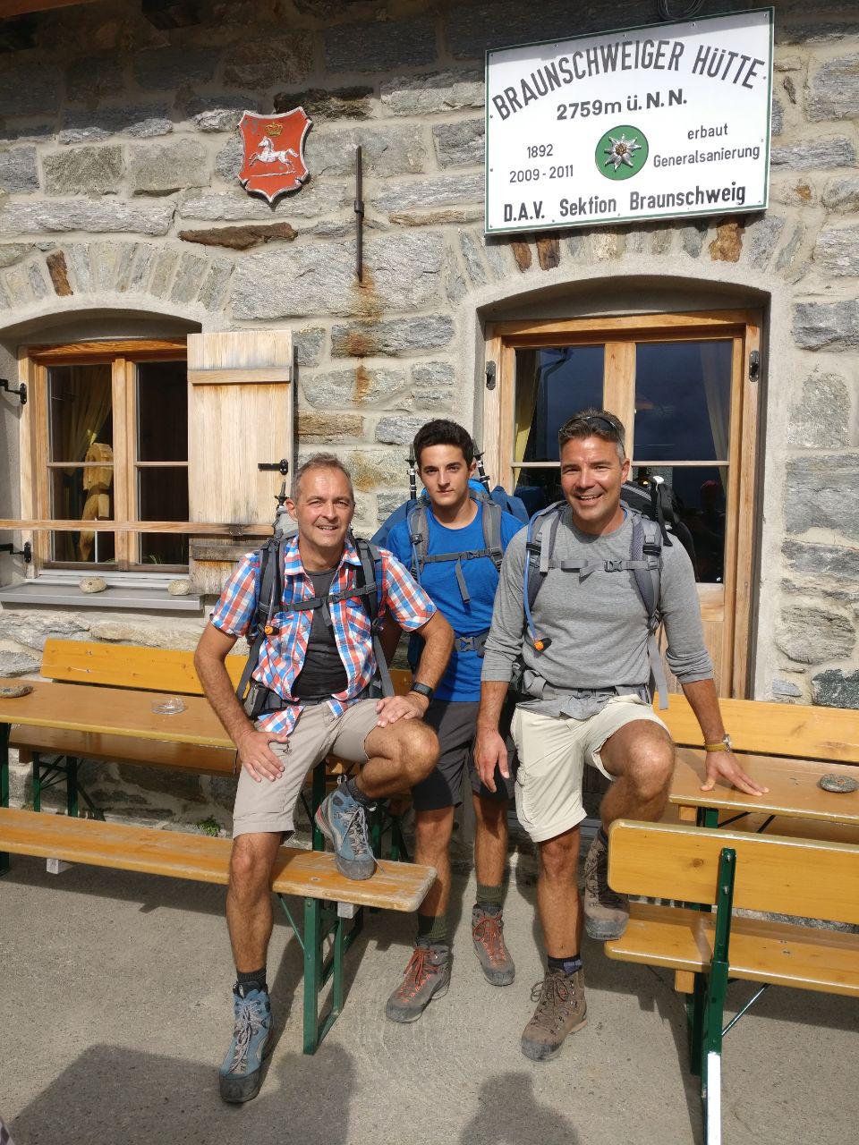 Nach einer kurzen Strecke auf der Fahrstrasse, die vom Pitztaler Gletscher herab führt, kamen wir über einen kleinen Steig auf das obere Drittel des Jägersteigs. Dort erblickten wir sehr bald die Braunschweiger Hütte – unser heutiges Tagesziel auf 2758m. Pünktlich zu unserer Ankunft klarte es auch wieder auf und die Sonne kam heraus. Jedoch hielt das nicht lange an … nach dem Essen zogen graue Wolken auf und es fing zu regnen an … ☹️