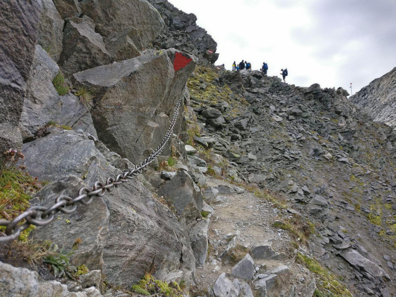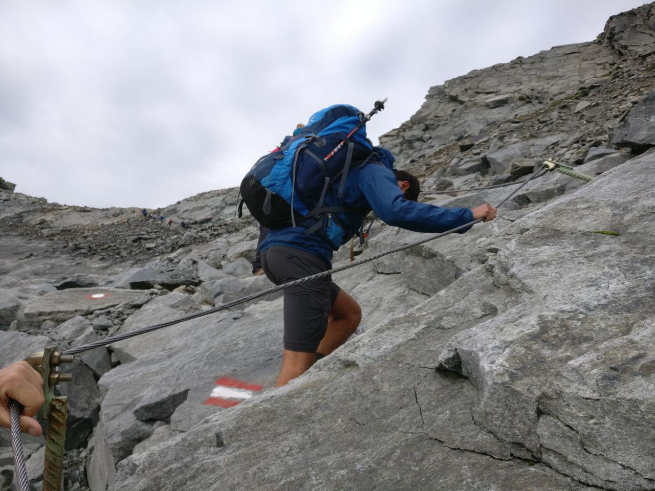 Anfangs über Blockhalden und danach über Geröll-Felder zog sich der Weg immer weiter nach oben. Die letzten 100 m mussten wir in stark ausgesetztem Gelände am Sattel queren. Stellenweise war der Weg hier auch mit Drahtseil-Absicherungen versehen.