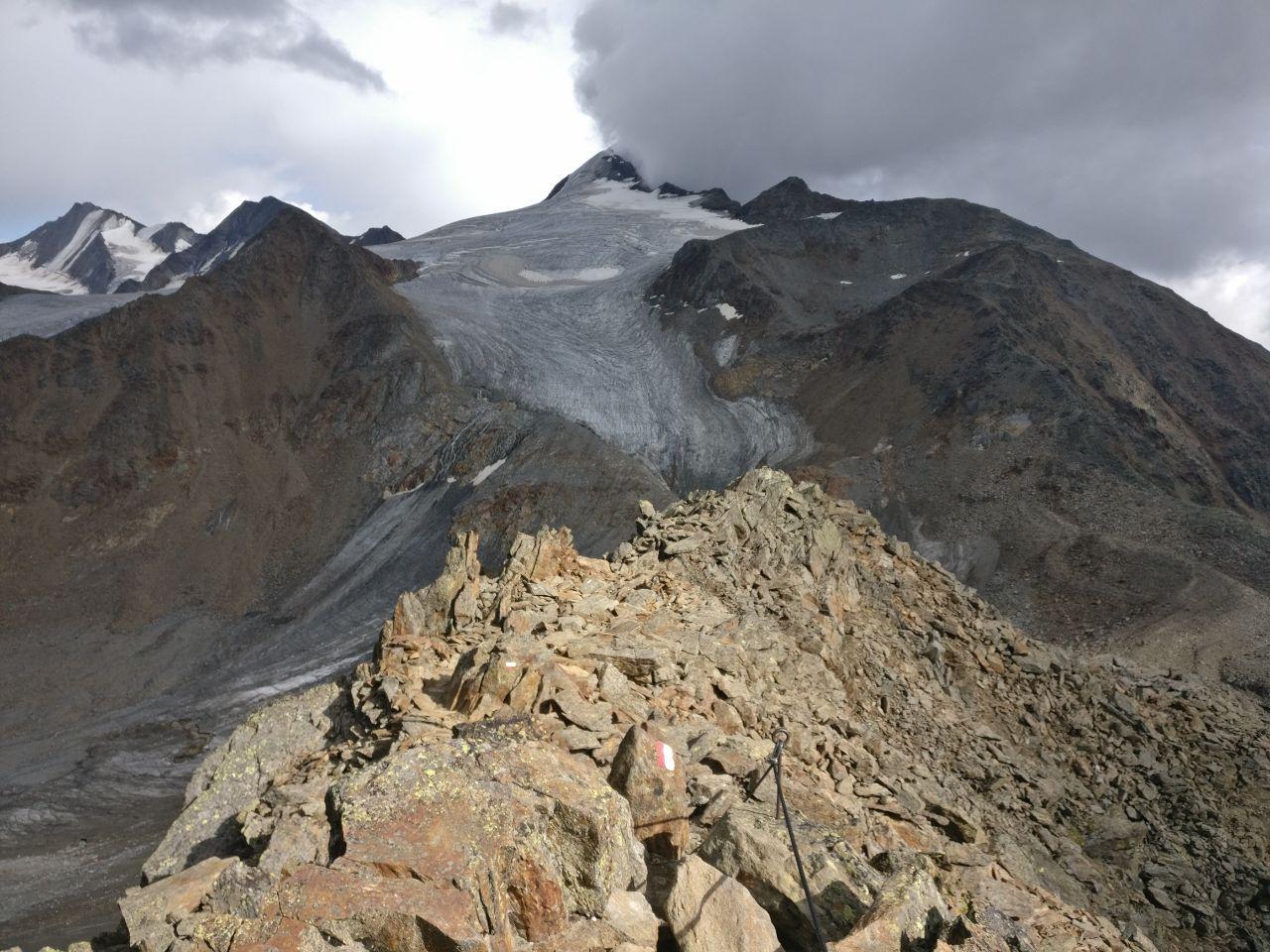 Da es auf halber Strecke zu regnen anfing liefen wir die Strecke in knapp 1:30 Stunden, was für diese Höhe schon ein beachtliches Tempo ist – die vergangenen Tage haben der Kondition schon gut getan. Aufgrund des Wetters hatten wir nicht unbedingt die Muse den Blick in die Ferne schweifen zu lassen. Immerhin erhoben sich Berge vor uns, die teilweise mehr als 3500 Meter hoch sind. Einer davon sollte uns noch etwas zu schaffen geben: der Similaun!