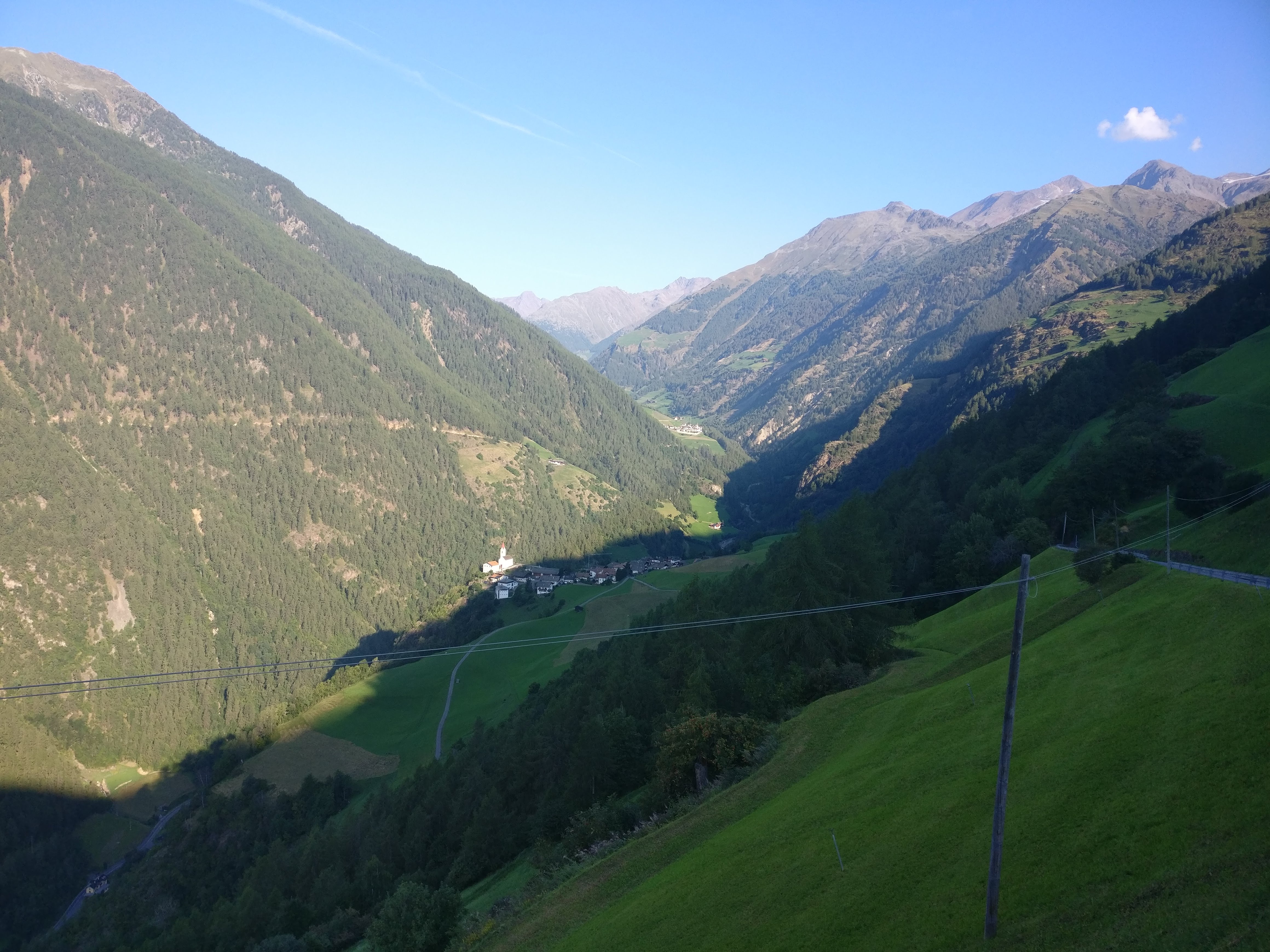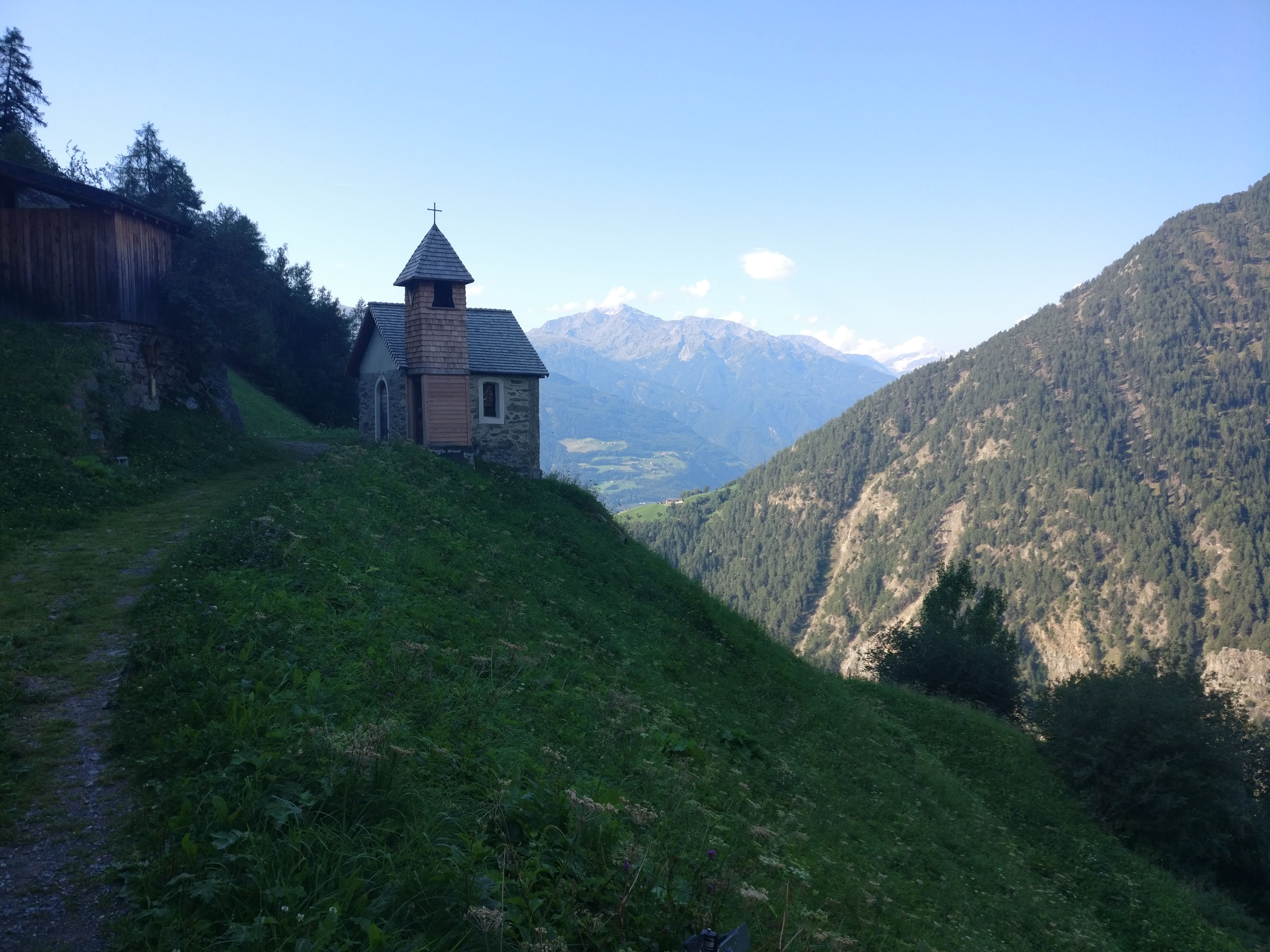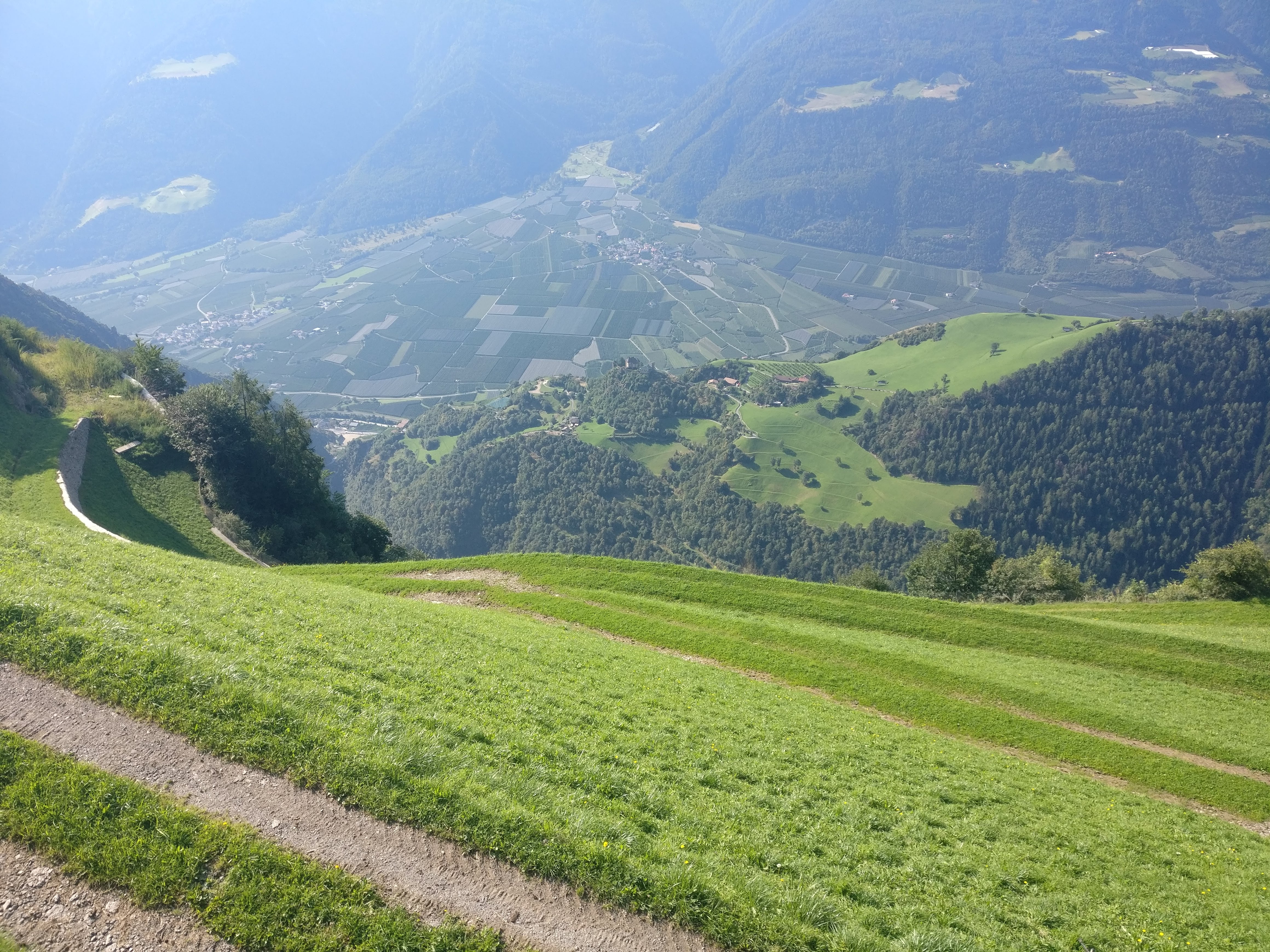 Unser Weg zog sich anfangs an den Hängen des Schnalstal entlang und wechselte dann unmerklich ins Etschtal. Immer wieder hatten wir atemberaubende Aussicht auf das uns zu Füssen liegende Tal, die hinter uns liegende Zentralalpen und sogar die Dolomiten könnten wir schemenhaft in der Ferne erkennen