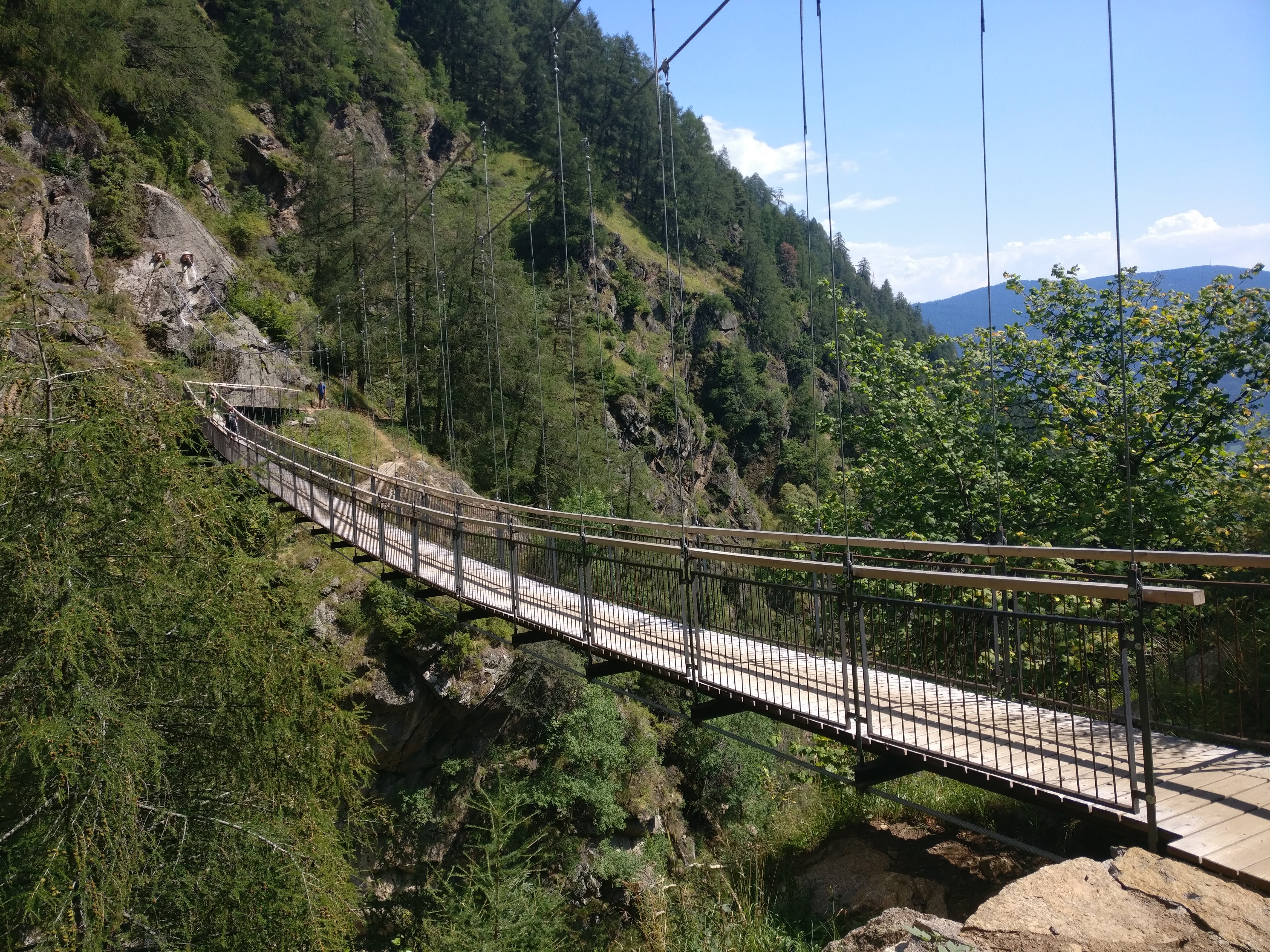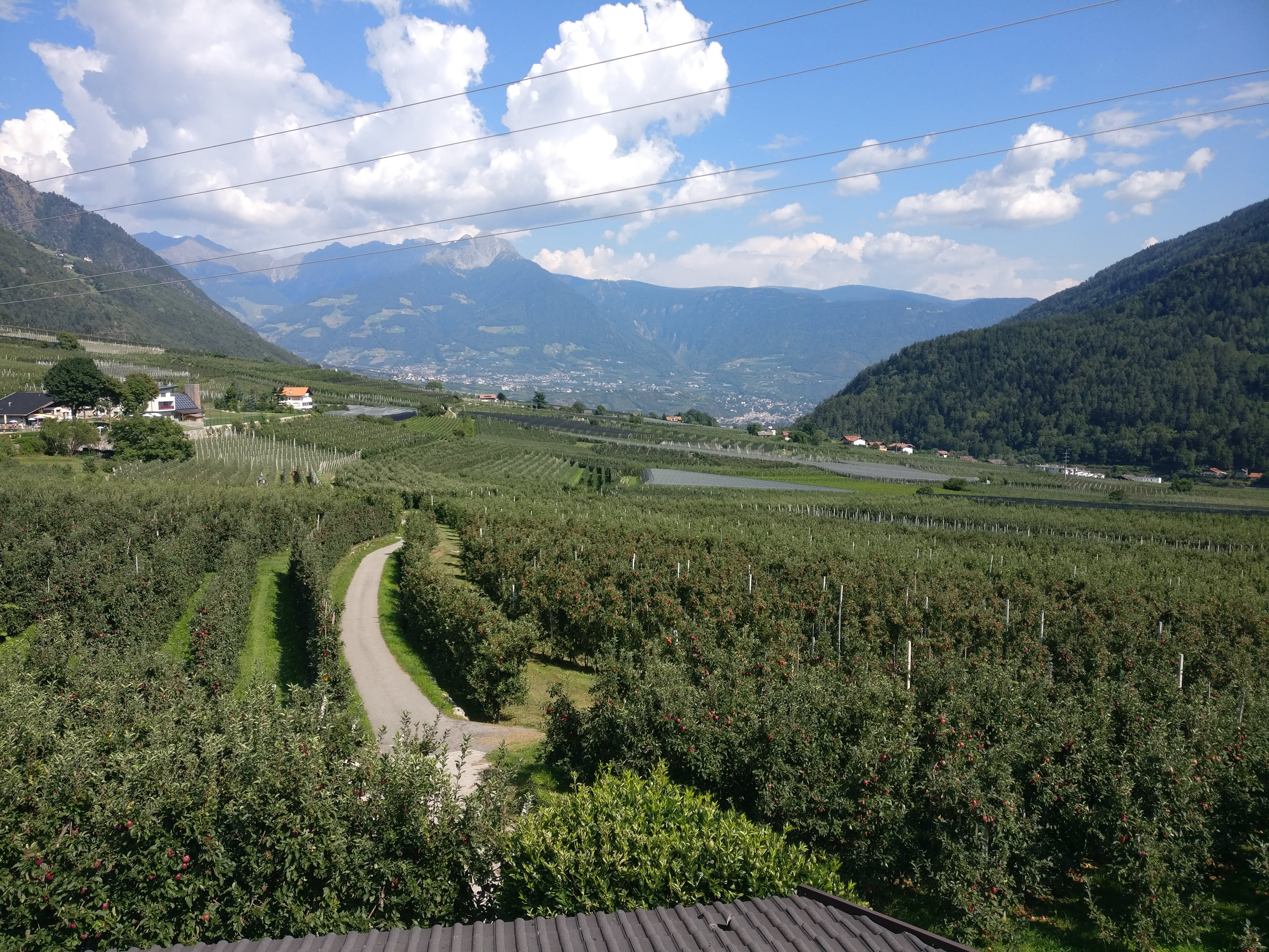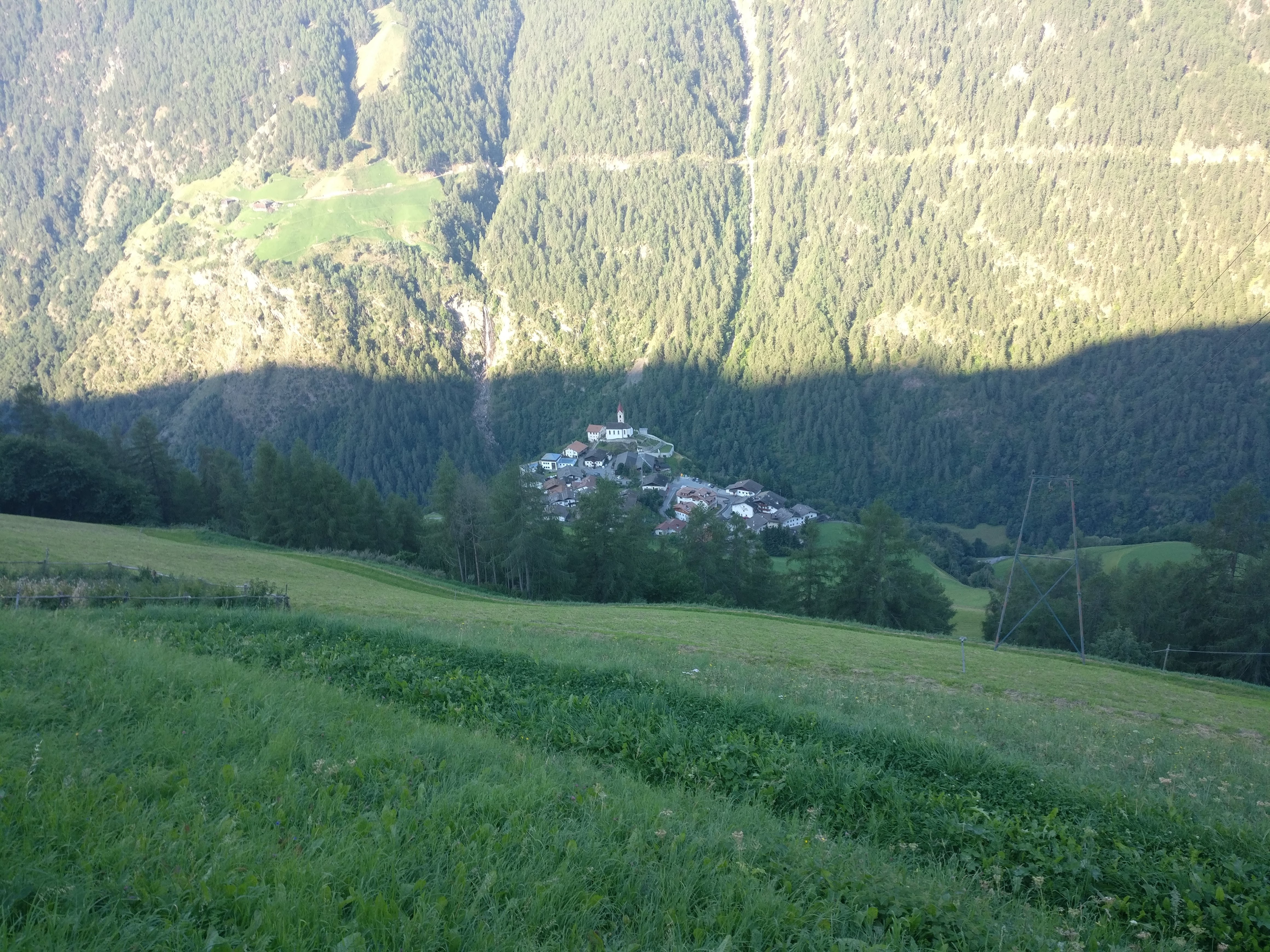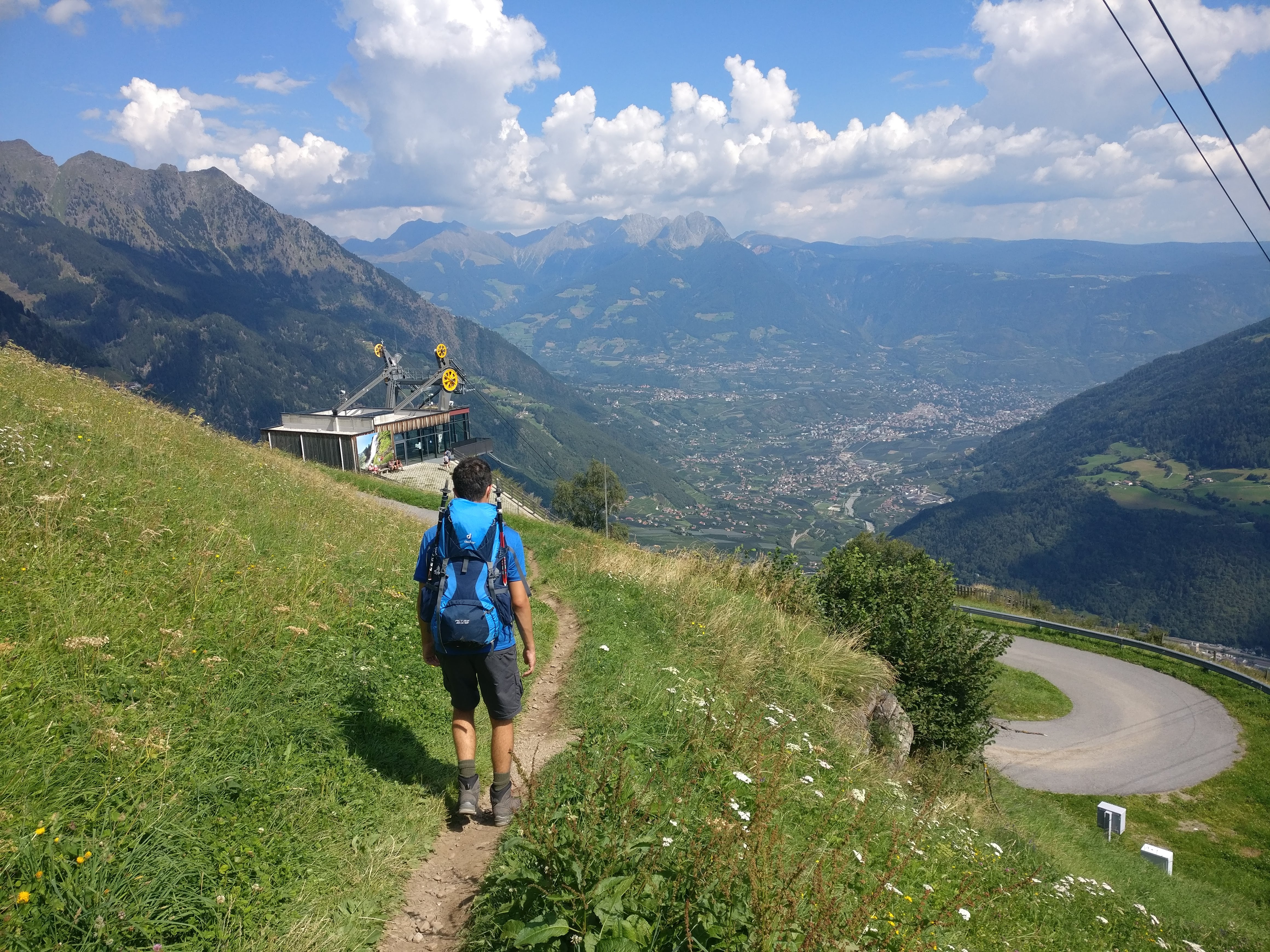 Kaum hatten wir die Stufen hinter uns gelassen, sahen wir das erste Mal Meran vor uns liegen. Von hier an ging alles sehr schnell. In kurzer Zeit hatten wir bei Giggelberg die Texelbahn erreicht, die uns ins 900 m unter uns liegende Etschtal nach Partschins bringen sollte – diesen Abstieg wollten wir uns nicht mehr antun. In Partschins angekommen mussten wir nur noch eine kurze Strecke zur Bushaltestelle laufen, wo uns der Linienbus nach Meran brachte